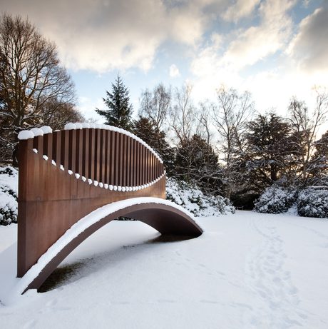 The 10-metre-wide Crossing (Horizontal) is made of Corten steel and invites the viewer to consider the work from many angles and distances, or in different seasons, and changes shape depending on how the work is approached. Horizontal, vertical or diagonal lines are commonly seen in his sculptures, and interact with their natural and urban contexts. A sister piece, Crossing (Vertical), is on display in the town centre in Barnsley.