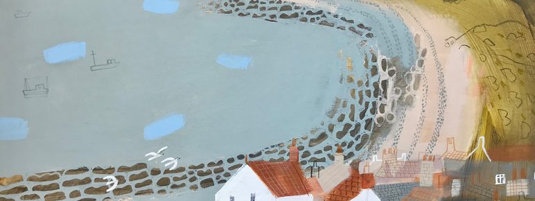 With a background in surface pattern and printed textile, Burrows creates expressive, textural depictions of British countryside and coastal areas in paint, using expressive brush strokes, subtle colour and delicate detailing. The medium of painting enables Burrows to explore her fascination and inspiration of the landscape with a carefully considered colour palette and a gentle hand, creating poetic scenes, rich with texture and delicate naïve detailing.