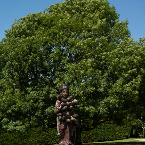 In the gardens surrounding the gallery are three large-scale bronze works from Kher’s Intermediaries series that take South Indian golu dolls as their starting point. These small, colourful clay figurines that are displayed in homes as part of the Navaratri festival depict gods and goddesses, animals and people. Following her process of rupture and reassembly, the artist describes how “by repairing and opening these figures and then fusing them together in new configurations, I was creating new avatars and possibilities of the self.” Kher has now scaled some of these hybrids to huge proportions and in doing so celebrates the complexity of identity, shapeshifting new beings across space and through culture. Ancestor (2022), a mother figure with the heads of 23 children emerging out of her body, is described by Kher as “a mythical and powerful female force that pays homage to the generations before and after her’’. At the top of the garden, the new five-metre-high work Djinn (2024) represents a new development in the Intermediaries series and stands majestically overlooking the landscape.