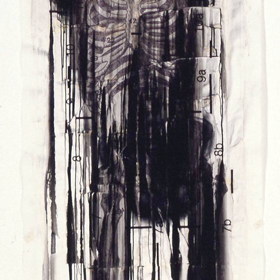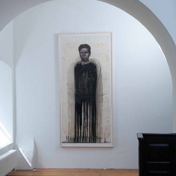 Adorning the walls are the dark forms of Anònims (2003), a series of 16 large-scale drawings. Shadowy, almost human-sized bodies with unknown faces stand as ciphers for generations, a community of souls. On the altar wall, works from the Continents (2003) series portray bodies as maps and geographies, and in the Chapel Garden visitors can walk inside the four-metre-high sculpture White Nomade (2021), its body made up of a fretwork of letters.