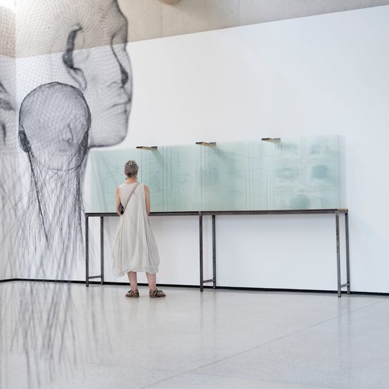 Shown in real life for the first time is April is the Cruellest Month (2020-21), a group of 28 drawings made during lockdown, that addresses universal psychological reactions to the pandemic, such as panic and anxiety, through an intensely personal lens. Like a visual diary, together they offer an intimate view into the artist’s thinking and fragility during this unprecedented period. Plensa also explores adding volume to drawing with etched bodies onto 3.7-metre-long layered glass slabs in Continents I & II (2000), and the suspended wire heads of Invisibles (2016) that he says “embolden the presence of the drawings on the walls”.
