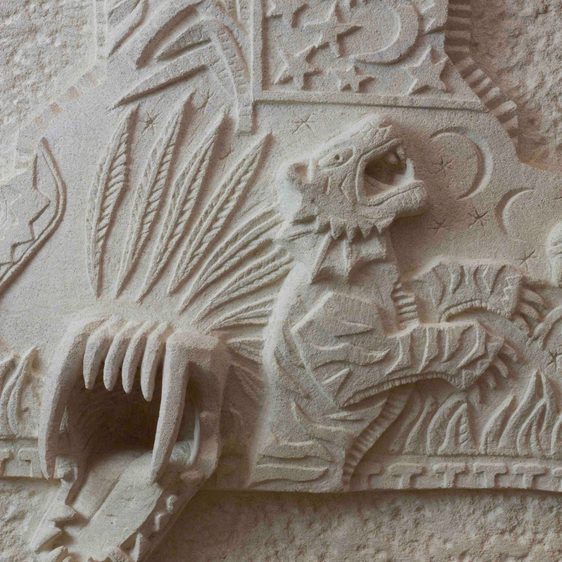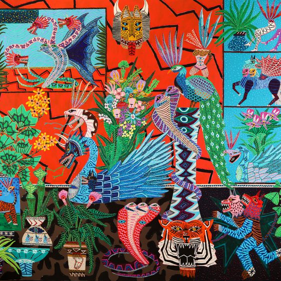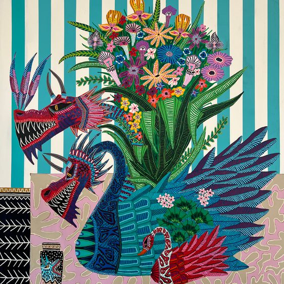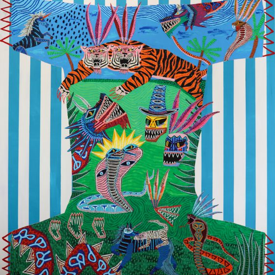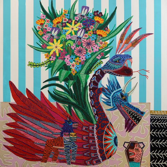 Known for the distinctive visual language of his paintings, the artist creates vast canvases flooded with bold colours and patterns, using characteristic flattened perspective and often set in fanciful landscapes. Within these imaginary realms, wolves, tigers and snakes dwell alongside fantastical hybrids such as unicorns and dragon-swans. More recently he has moved into sculpture, taking his cast of characters into three dimensions, rendered in bronze, stone, clay and even fake fur.