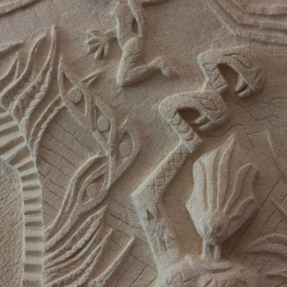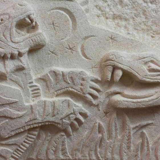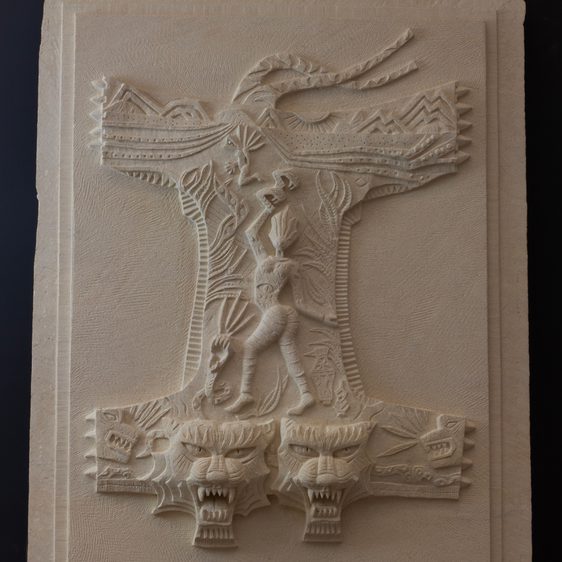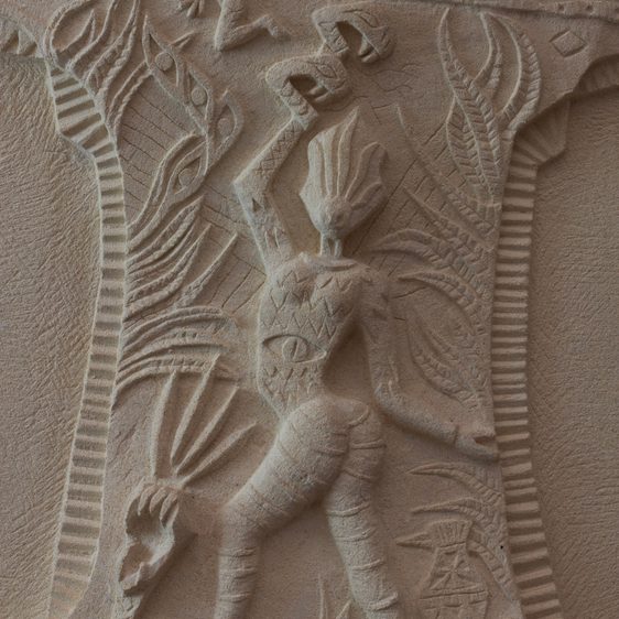 Inside the light-filled Weston Gallery, new stone sculptures and reliefs include After the Storm (2025) and Before the Storm (2025), the Gaillac Stones named after the 7th-century town where Kerwick and his family live. These works expand on his notion of discovering artefacts that provide clues to long forgotten peoples and stories. Three small, enigmatic terracotta figures also draw on this theme.
