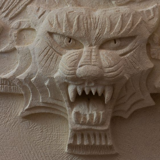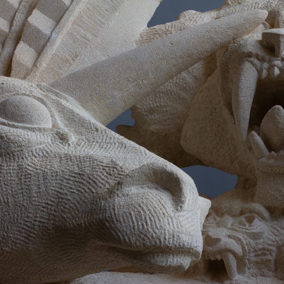 Outdoors, the three-metre-high sculpture The Presence, The Power (2025) brings together five creatures seen throughout Kerwick’s work: the bear, lion, tiger, wolf and cobra. Each of the stacked heads has two mouths, alluding to the central theme of giving and taking. This work connects the exhibition across the YSP landscape to his sculpture Hydra vs Bear(2023), which is on display outdoors near the Underground Gallery.