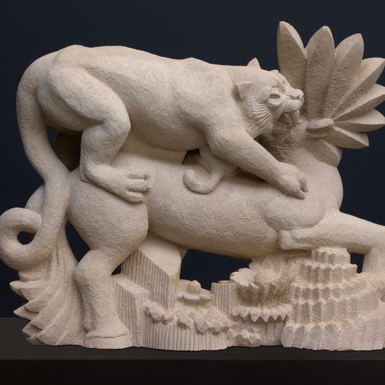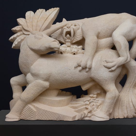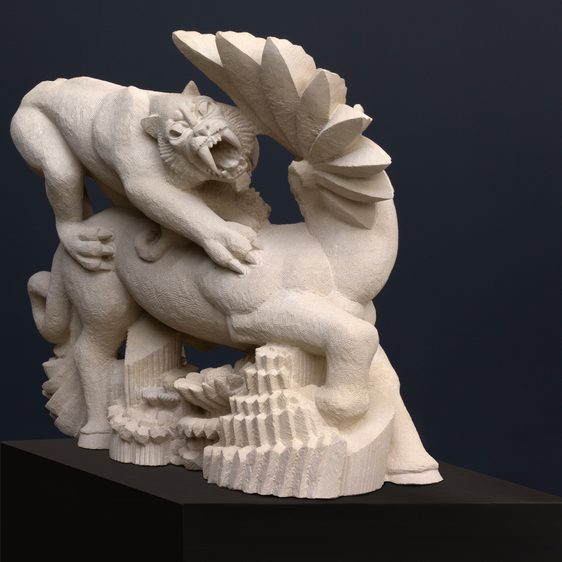 Kerwick is fascinated by apex predators and the duality of their majestic but threatening nature. Carved in the round, The Reckoning (2025) shows a feathered unicorn being devoured by a three-headed, fanged beast, echoing sculptures from antiquity such as Lion Attacking a Horse (325-330 BCE) and more recently, George Stubbs’s depictions of the same subject.
