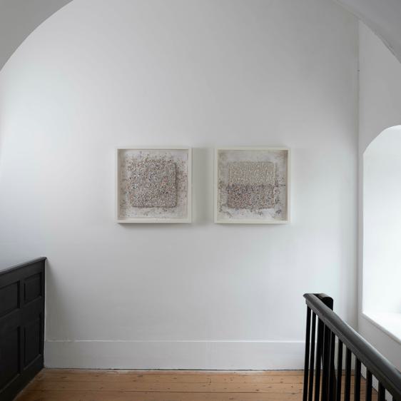 Drew is driven by relentless curiosity, which he feeds through travel. From 2015, for four years, he made numerous visits to Jingdezhen in China, known for over 1,700 years for porcelain production, where he was fascinated by the ‘alchemy’ of the making process. Inspired by, but also working against the tight parameters of the tradition, he experimented with abstracting from conventional ceramic forms by smashing them into fragments and firing them together to see how the pieces fused in the kiln. These shattered pieces informed his work in other materials and directly contributed to the treatment of the plywood seen in Number 360. Critically, through his experience of ceramic glazing, surface design and working with different types of clay and earth in Jingdezhen, colour began to seep into Drew’s previously largely monochrome work. In Number 360, the coloured elements are covered with acrylic paint mixed with sand to give a rough, dry texture. Persian rugs provide the visual origins for the work’s colour palette and its painted patterns.