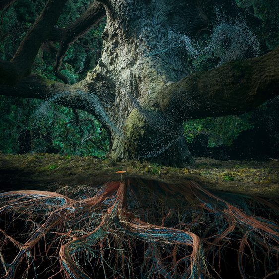 Using LiDAR scanning, ground-penetrating radar, CT-scanned soil samples, and thousands of photographs, Marshmallow Laser Feast have created a remarkable “digital double” of Kew Gardens’ majestic Lucombe Oak. The result is a mesmerising large-scale video installation accompanied by a surround-sound audio environment – composed from 24 hour recordings made by sound artist James Bulley and arborists at Wakehurst, Kew’s wild botanic garden in Sussex – that fills the Chapel with the living soundscape of the oak.