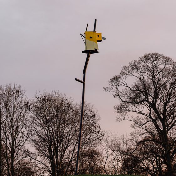With its tall, slender stem The Watchtower mirrors the upward reach of a tree’s trunk and at its summit like a canopy a cluster of geometric boxes forms a treehouse-like structure. Windows frame views of the surrounding landscape, while its inaccessibility enhances its mystery and purpose. de Vries invites visitors to shift the way they move through and perceive a place, inviting openness, alertness, and a new point of view.