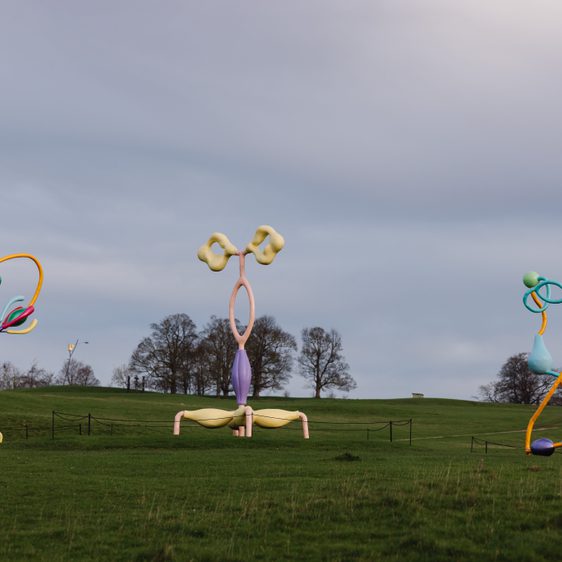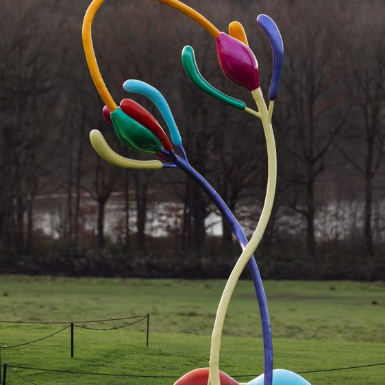 Commissioned by Bradford 2025 UK City of Culture, Vanessa da Silva’s Muamba Posy was first exhibited on the moors of Penistone Hill near Haworth, West Yorkshire, before continuing on its journey to YSP. Its large organic forms and vivid colours were inspired by the areas’s ever changing cycles of nature, where life has continuously adapted over time.