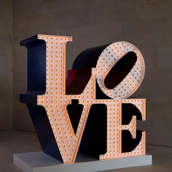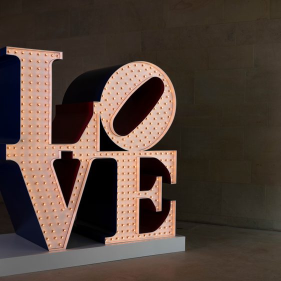 Robert Indiana, The Electric LOVE, 1966-2000, installation view at Yorkshire Sculpture Park, 2022. Photo: © Jonty Wilde, courtesy of Yorkshire Sculpture Park. Artwork: © 2022 Morgan Art Foundation Ltd./ Artists Rights Society (ARS), New York/DACS, London