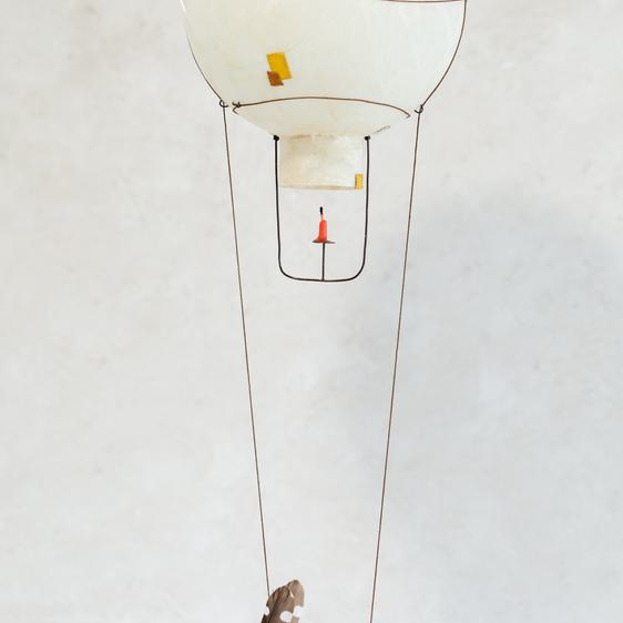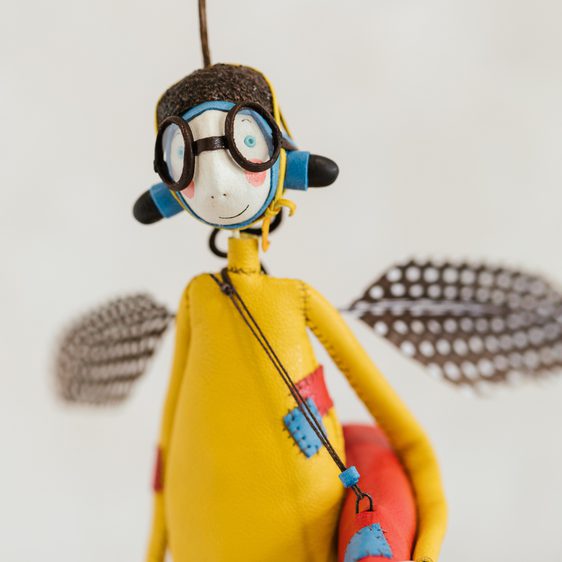 For two decades Bryan has been making humorous yet industrious fairy-like creatures; adorned with items from her eclectic hoard of buttons, spotted feathers, seed pods, dyed leathers, and contraptions influenced by Victorian flying machines. She combines these materials and found objects to inform their intriguing personalities.