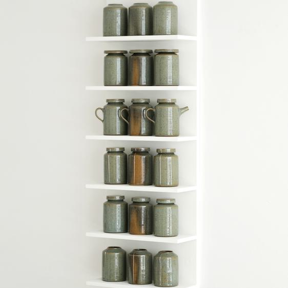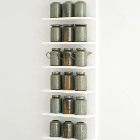 Gadsby’s elegant aesthetic is inspired by pared-back forms and items of everyday use that are simple and straight-sided, and that he could imagine living with and using. His glazes are subtly detailed, full of depth and commonly glass-like in nature with crackled, iron-flecked surfaces and containing varying percentages of red iron oxide to change their colours from white to blue or green. Gadsby’s palette also embraces whites, blacks and metallics from bronzes to gun-metal.