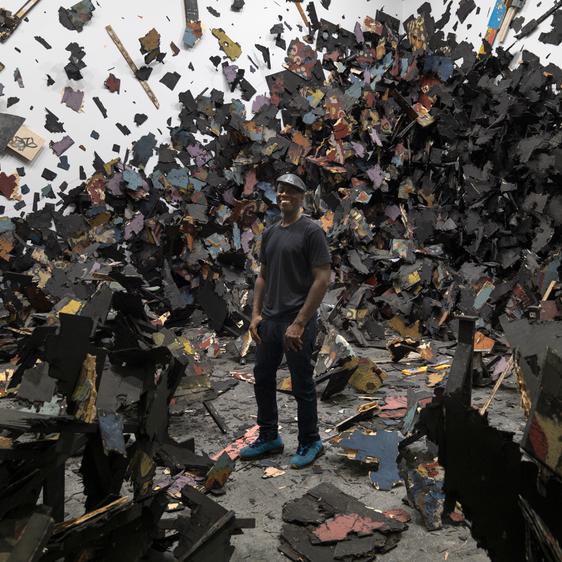 The artist Leonardo Drew, with Number 341, 2022, Art Basel: Unlimited, Switzerland. © Leonardo Drew, Photo: Jon Cancro. Courtesy of Goodman Gallery, Galerie Lelong & Co., Anthony Meier Fine Arts
