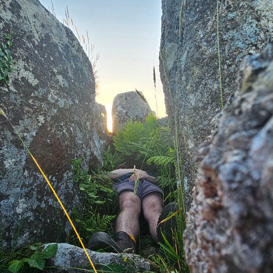 Claye Bowler, Self Portrait in Bosiliack Barrow at sunset Cornwall, 2024. Photograph © Claye Bowler. Courtesy the artist