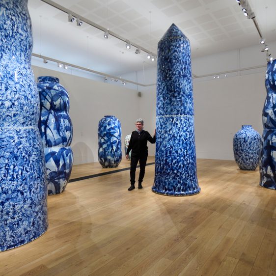 Expressions in Blueis an extraordinary forest of monumental porcelain forms by renowned ceramicist Felicity Aylieff. Painted in cobalt blue underglaze with expressive, abstract brushstrokes, these hand-thrown ceramic vessels and stacked monoliths stand up to five-metres high. Shown in The Weston Gallery and outdoors, the organic energy of their surfaces will resonate with the forms and rhythms of the 18th-century landscape beyond.