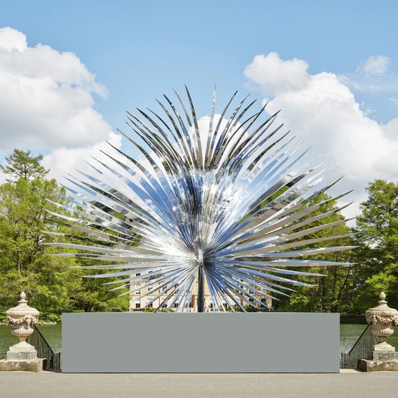 Marc Quinn’s extraordinary monumental sculpture spans five metres in width and is formed from highly reflective polished stainless steel. Sited this summer in YSP’s Country Park, the work was created for Quinn’s 2024 exhibition Light into Life at Royal Botanic Gardens, Kew and is a ‘portrait’ of a palm leaf from Kew’s Palm House. The artist worked with Kew scientist Dr William Baker to develop the work based on a Sabal palmetto tree leaf – one of the earth’s oldest plants. Quinn imagines the sculpture as a mirrored vortex through time and space to the beginnings of life on earth.