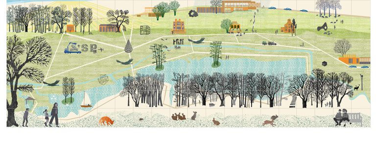 Decorative Minimalist features a large-scale, illustrated tile mural entitled Walk in the Park. Designed exclusively for YSP, the mural consists of 160 ceramic tiles that capture the everyday life and soul of Yorkshire Sculpture Park. Yorkshire’s elemental weather, iconic works by Henry Moore and James Turrell, historic architecture such as Bretton Hall and the 18th century chapel, large sculptures being installed, a medley of wildlife by the lakes, and families enjoying a stroll, reinforce Milner’s and YSP’s belief that spending time outdoors surrounded by works of art and nature is good for your mind and body.