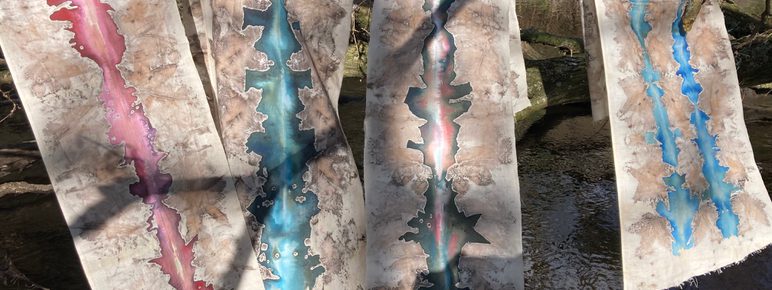 Folklore and mythologies are a central part of the artist’s research and thinking. During her time at YSP Horrocks has spent time working in the Boathouse and has been particularly drawn to water, inspired by the European folklore of Melusine, a female spirit of water. Horrocks has continued to develop her textile practice and has experimented with the ‘dirty pot’ method to transfer natural dyes from leaves to fabrics, echoing the re-occurring patterns that we find on different scales in nature, to create wearable, articulated sculptures. A new video work was also projected in the Boathouse that explores Horrocks’ connection to water in the landscape.