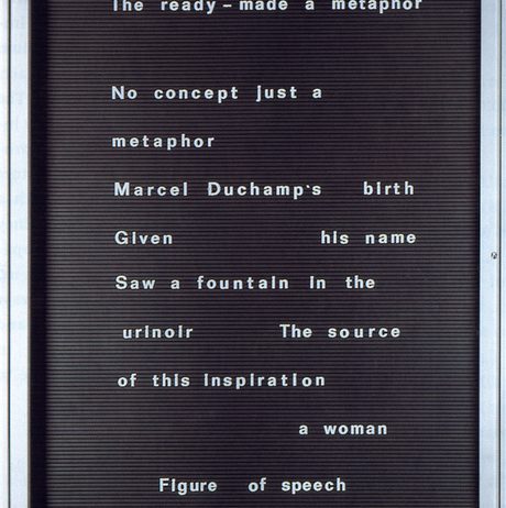 Bethan Huws’ delicate, oddly intriguing and rigorous works continued a vein of artistic enquiry initiated by Marcel Duchamp in the early 20th century: ‘art as idea’. As though peeling an onion, she revealed layer on layer of meaning in language with incisive intellectual clarity.