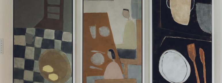 She paints with acrylic, applying it to the canvas using rollers rather than the traditional paint brush to build the paint up layer after layer, with a warm palette of greys, browns and mustards. Influenced by Outsider Art, Art Brut and Folk Art – terms used to describe art with a naïve and decorative quality – her alluring paintings depict recognisable household objects and people in domestic settings, and are inspired by her experiences of everyday life.
