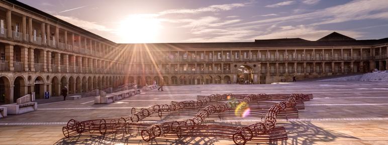 Responding to the primary function of the Piece Hall as a renowned centre for trading cloth, and building upon the ‘textile language’ that had been central to the artist’s own practice in recent years, Murphy developed the motif of the ‘magnified thread’. Closely related to his previous sculptural works, where steel wires were bent and woven through rings to form rigid tubes, Blanket wasa new work that was centrally located in the courtyard to present a focal point and act as a meeting place.