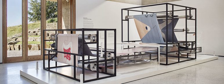 Referencing ideas relating to skin as a physical ‘container’ of the body, Hendry produced a skin-like material inlaid with images and objects, persistently moved through a system of rollers within an 8-metre long machine. Brightly coloured images within the material included cartoon-like illustrations of what lay beneath the surface, in this case anatomy, food and detritus.