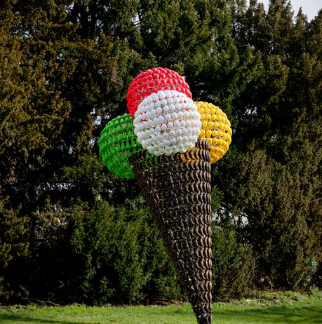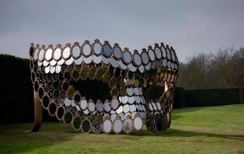 In the open air stands Solitário [Solitaire] (2018), a seven-metre-high ring made of golden car wheel rims topped with a huge diamond crafted from crystal whisky glasses. Representing the stereotypical ambition of our society to acquire wealth and material possessions, the work unites symbols of luxury – cars, jewellery and alcohol – which bridge social classes. Sited at one of the highest points in the park and drawing attention to one of the most wonderful views across the landscape, Solitário entices visitors uphill and creates delight in the discovery of its fabrication.