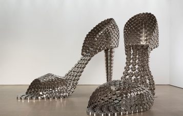 Made from stainless-steel saucepans, the iconic oversized silver stilettos of Marilyn (2009/2011) comment on social conventions and highlight the division between women’s traditional domestic and contemporary public roles. Referencing Marilyn Monroe, one of the most notable American actresses to symbolise female sexuality, the work pays homage to her absent figure. Marilyn proposes a revision of femininity by drawing attention to dichotomies which play a significant role in Vasconcelos’ practice, including private versus public life, tradition versus modernity, and ‘pop’ culture versus ‘high’ culture.