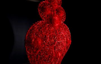 These sculptures are joined by the stunning and elaborate Red Independent Heart #3 (2013). For this work, Vasconcelos makes use of the form of a well-known Portuguese emblem, the Heart of Viana, which symbolises honesty and generosity, and scales it up to over three metres high. The sculpture rotates in the gallery space and is made entirely of red plastic cutlery, which has been abstracted to such an extent that the lines between luxury and coarseness are blurred. Dramatically lit, it is accompanied by recorded Portuguese fado songs, which speak of love, loss and the conflict between emotion and reason.