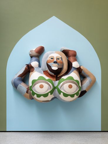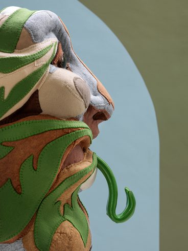 Humour and storytelling are important elements in Baldock’s artwork. Shapeshifting and hybrid characters allow him to explore a fluid, queer space without rules or binaries. For Touch Wood he has made new textile sculptures based on three 500-year-old wooden carvings in Wakefield Cathedral. The first is of a person exposing their buttocks. Although this seems an unlikely subject to be found in a church, bawdy images like this were common in medieval times. The others are composite creatures: a sphinx-like beast with an animal’s body and a human face; and a Green Man. This is an ancient, mythical figure associated with spring, transformation and rebirth, with a face made of leaves. Baldock’s imagination was sparked by the subject matter, freedom of expression and playfulness of the original carvings.