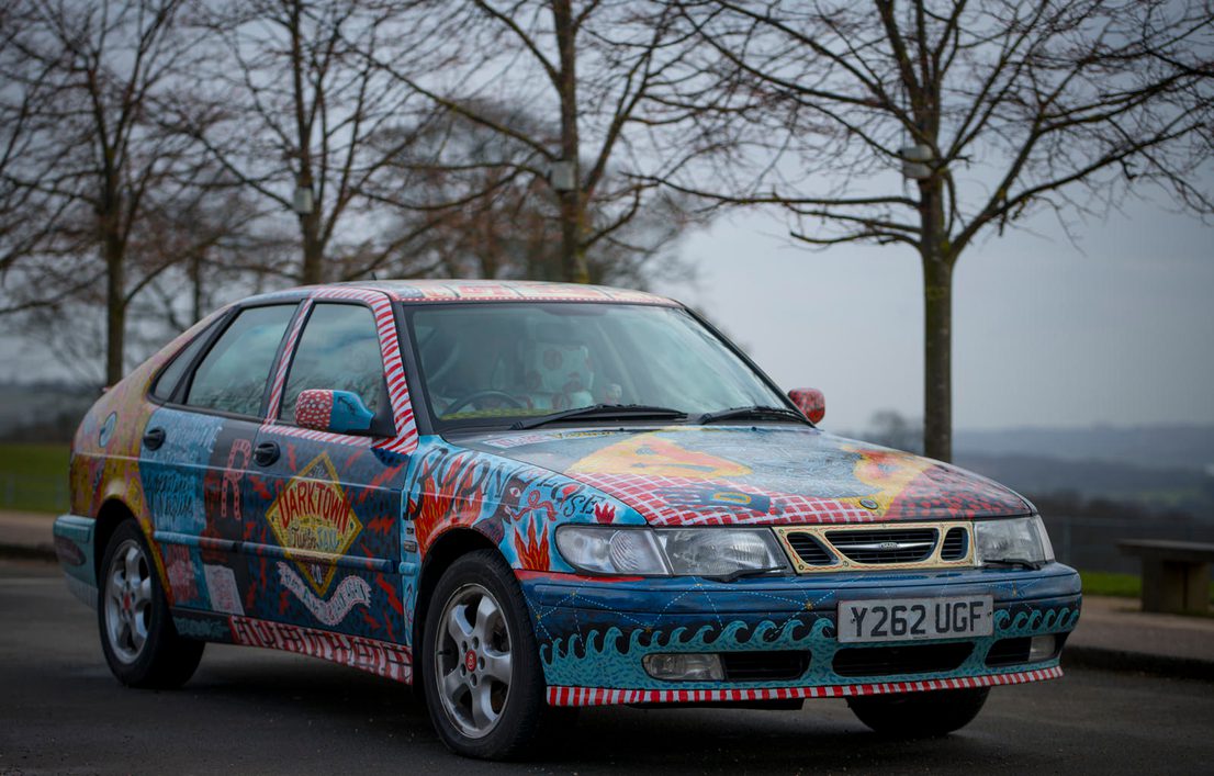 Hannah purchased a second-hand Saab 9-3 and customised it in his studio. One week later, the taxi was ready to take fares in and around Darktown. It’s been taking Jonny and Sharon (the Queen of Darktown) and their Cakes & Ale Press to print fairs and gallery events across the UK ever since. The Turbo Taxi acts a mobile advert for some of the emporiums and establishments that can be found on Main Street, luring the public in and hoping people will find Darktown as inspiring and exciting place to visit as the artist does.