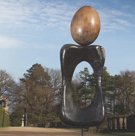 Oeuvre (Verdigris) is made of bronze and features markings reminiscent of a duck egg. Placed in a natural landscape setting at YSP, this oversized egg seems realistic and familiar, whilst also being comic and surreal due to its scale.
