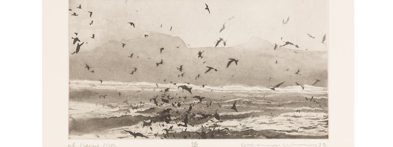 Starting in the extreme north of the Shetland Islands, The Furthest Lands journeys south over 950 miles to the far south-west point of Ireland, through a display of the artist’s intricate aquatint etchings and a small collection of watercolours. Ackroyd’s characteristic muted tones add depth and energy to both familiar and faraway landscapes, including works such as Ailsa Craig, Firth of Clyde (1986), Treshnish Islands, Hebrides (2007) and Off Hermaness, Shetland (2018).