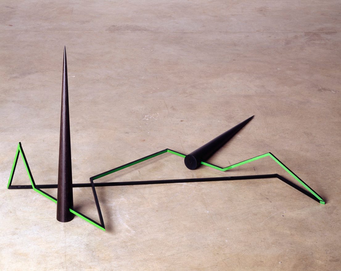 Soda Lake (1968) by Nigel Hall is a response to the physical geometry of the southern Californian lake of the same name in the Mojave Desert, where the views extend so far it is possible to perceive the curvature of the Earth. Hall observed that ‘spatial intervals and distance were the dominant features of the landscape, which was also intensely silent. It seemed, there, less important for forms to occupy space than that they should have the ability to indicate space and draw attention to it… The subject matter of Soda Lake is space, and its components determine how the space is channelled, trapped or disclosed’.