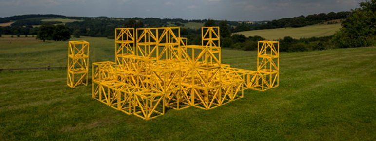 The exhibition also features two new works by British-Pakistani artist, Rasheed Araeen. Jub Chuker Chulay Jayain (When the Chakras Float Away) (2016–17), sees the concept behind two of the artist’s historic works – Chakras and Triangles, made in 1969 and 1970 respectively – combined to create an entirely new work. Jub Chuker Chulay Jayain (When the Chakras Float Away) features painted plywood circles which float on the historic Lower Lake, photographs of which are displayed alongside painted plywood triangles in a 4 x 4 formation. Araeen’s Zero to Infinity (2016–17), a large interactive sculpture made of colourful wooden open-framework cubes, is presented in front of Longside Gallery’s vast windows overlooking the Bretton Estate. Arranged in the open air, the cubes are initially positioned in an ordered structure, but the artist’s intention is for viewers to interact with its components by moving them into new configurations, breaking down the hierarchy of sculpture production.
