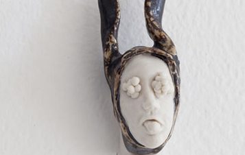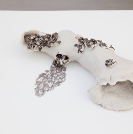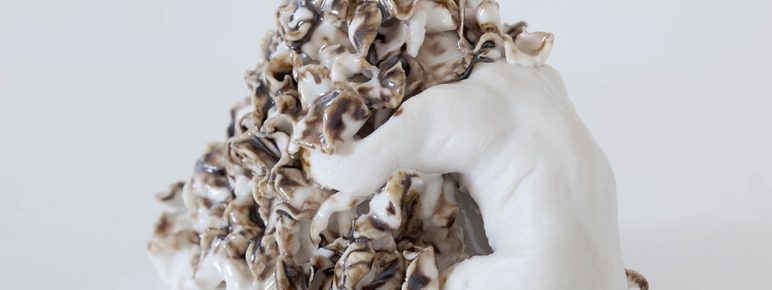 Exploring themes of fear, desire, vulnerability and isolation, Goodyear invites the viewer into a dark place where human psychologies and animal behaviour collide and merge. The exhibition included a new series of work inspired by time spent discovering the physical and imagined landscape at YSP, resulting, for the first time, in small-scale sculptures. As if scrambling from the pages of Goodyear’s sketchbook, figures appear in the gallery as animations and porcelain sculptures, still fragile and unsure of their new configuration. The viewer struggles to recognise the human or animal depicted in sculptures such as the hazards of falling asleep in the woods but is nonetheless intrigued by what could have happened to these creatures, whose bodies have become engulfed by a strange material.