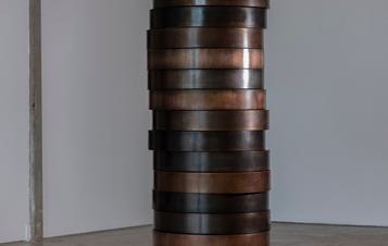 Other sculptures inside and outside the gallery are formed from Yorkshire stone and rusted Corten steel, bronze, as well as painted aluminium. Relating again to horizontally striped paintings, they are arrangements of stacked elements, such as square steel frames and circular coins, placed one on top of the other. Constantin Brancusi is an obvious precursor, but in the most elemental sense these works recall a child stacking pebble on pebble, block on block, to form one of the most basic sculptural forms. In Scully’s hands these stacked works are a muscular extension of vertical paintings and, as in much of Scully’s work, the biographical.