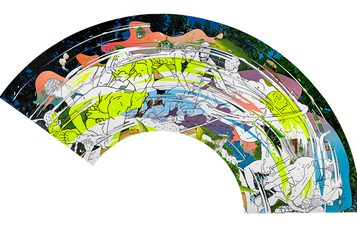 A huge and intricate painting in the shape of a wrestling arena was split into sections and shown on the gallery walls. The paintings were comprised of five layers, which linked to the hardships and dire situations faced by the farmers in Farmer is a Wrestler, including wrestling figures inspired by the artists’ interviews with the farmers and their families; the crops and the associated activities vital to their livelihood; and a highlight, which gave emphasis to the issues under discussion.