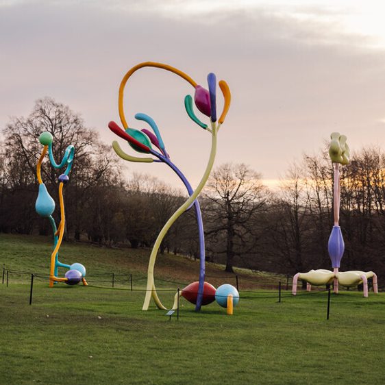 Muamba Posy was first exhibited on the moors of Penistone Hill in Haworth, West Yorkshire. Its large, organic forms and vivid colours are inspired by the Hill’s ever changing cycles of nature, where life has continuously adapted over time.