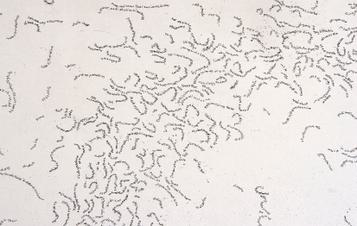 For a series of works made in the 1990s Boshoff explored fifteen ancient stone circles in the UK and collected bundles of twigs at each one before sunrise. The intricately formed wooden sculpture Annuloid (1993-1994) contains small clusters of these twigs, each with a description of where they were found written in braille underneath, and presented in an immaculate torus form. This and a number of other wooden sculptures can be seen in this exhibition.