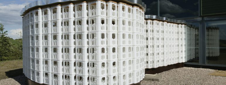 Exploiting the aesthetic and structural properties of recycled bottle crates, Winter/Hörbelt’s international reputation was secured by their full-scale ‘crate houses’; beautiful, light filled pavilions constructed from crates which, when stacked like building blocks, are both sculpture and structure.