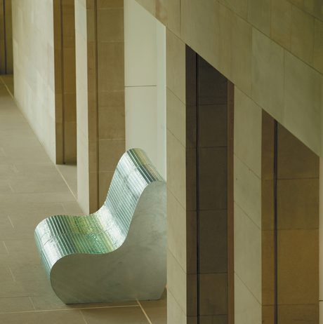 An outdoor pavilion or Basket was also commissioned, to be sited within the 18th and 19th century-designed landscape. This large, two-storey steel structure with interior seating was sited at the top of the valley, acting as a viewpoint, shelter and route-marker to the gallery. The Basket’s double-layered steel mesh construction challenged the viewer’s sense of perspective; when viewed against the skyline and pierced by the sunlight, its solidity dissolved. A similar translucency was experienced from inside the structure, which enclosed and protected but also provided glimpses of the outside world and the expansive views beyond.