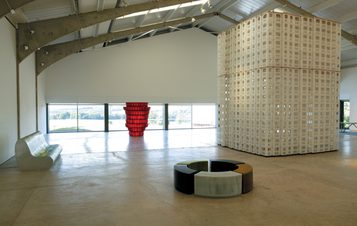 In 2004, YSP commissioned two different-coloured crate houses for the 500-square-metre Longside Gallery. The gallery’s front wall of floor-to-ceiling windows flooded the space with natural light, which penetrated the houses’ translucent structure, linking the interior and exterior spaces. One crate house was bisected by the gallery window so that it could be entered from both inside of outside the gallery. The luminous and meditative environments, with seating, invited internal exploration and encouraged contemplation and the interaction of visitors with the crate houses completed them as artworks.