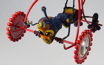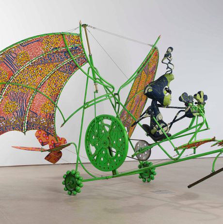 Highlights also included two Flying Machine sculptures (2012) piloted by fabric-skinned aliens, one of which was suspended from the ceiling as though coming in to land. Alien Man on Flying Machine (2011) and Alien Woman on Flying Machine (2012) reference the artist’s interest in early flight, space exploration and science fiction while connoting ideas of foreign citizenry and strangeness.