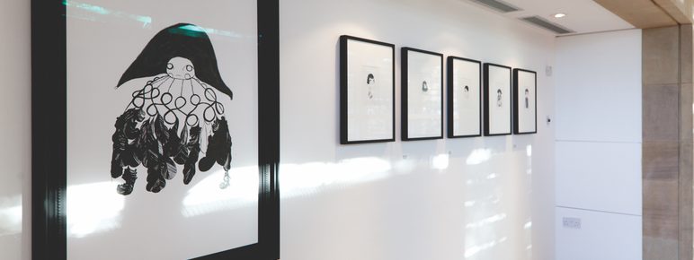 Mirror Mime showcased original and limited edition framed works for sale, including intricate ink drawings and silkscreen prints. The Upper Space featured 11 original works complemented by boxed dioramas, vintage china with platinum hand-painted designs and a collection of Little Treasures – vintage jewellery pieces such as lockets and pocket watches framing miniature wearable originals by the artist. Zara’s distinctive creations also adorned the shop and 20-metre concourse windows, welcoming visitors with imagined scenes designed exclusively for YSP as her creatures and characters appeared to have travelled from distant lands to a decadent Gatsby-esque party.